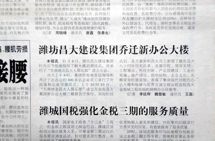 2013年11月09日,集團喬遷至高新區健康東街6999號,濰坊日報、濰坊晚報刊登集團喬遷慶典的報道。