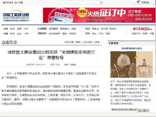 濰坊昌大建設(shè)集團(tuán)榮獲“全國建筑業(yè)先進(jìn)企業(yè)”榮譽(yù)稱號(hào)——中國工程建設(shè)網(wǎng)“企業(yè)動(dòng)態(tài)”2