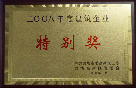 會議通報表彰了去年經濟工作中,支持高新區科學發展、和諧發展、率先發展的各類先進典型。集團公司被授予2008年度建筑企業特別獎。