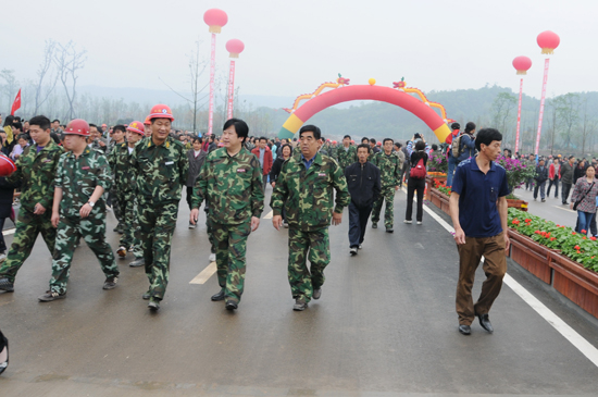 5月12日,由集團(tuán)公司第二分公司援建的北川新縣城安昌河西羌北橋工程舉行了隆重的竣工通車儀式。濰坊市委常委、副市長(zhǎng)、山東省援川前方總指揮徐振溪,北川新縣城工程建設(shè)總指揮王綿生,北川縣副縣長(zhǎng)荊大中,濰坊市援川前方總指揮桑福嶺等領(lǐng)導(dǎo),參加援川的濰坊各方面代表、當(dāng)?shù)厝罕娊顺鱿私裉斓耐ㄜ噧x式。集團(tuán)公司總經(jīng)理朱九洲及參加援建的有關(guān)分公司經(jīng)理出席了今天的通車儀式。 ![]() 總經(jīng)理朱九洲(前排左四)與援建人員共享援建成果 ![]() 首個(gè)通過(guò)大橋的車輛