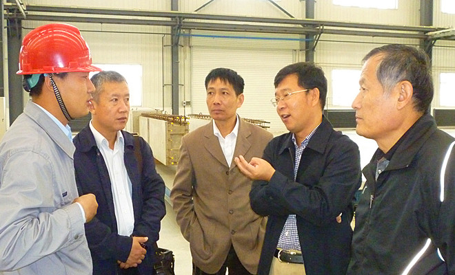 上圖為徐鵬強董事長(右二)在沈陽工業化部品生產車間與車間負責人交流   上圖為徐鵬強董事長(左一)在參觀沈陽第12屆全運會安保工程PC技術應用