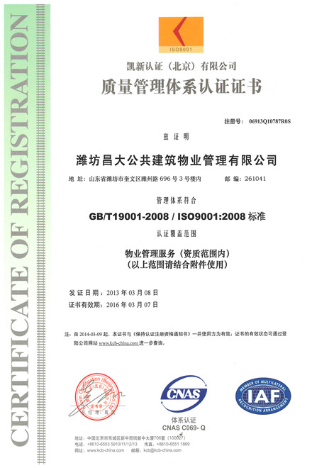 近日,集團公管公司(濰坊昌大公共建筑物業管理有限公司)通過ISO9001質量管理認證。ISO9001質量管理認證的取得和實施,對于公管公司提高物業管理水平,擴大企業知名度,增強企業競爭力都有約束和推動作用。