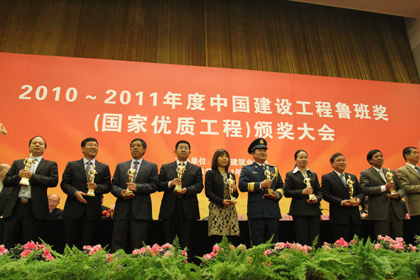 會上,集團公司還榮幸地作為授獎代表登上領獎臺接受了魯班獎證書和魯班金像。本次頒獎大會共通報表彰2010-2011年度的200個獲獎工程和750個承建、參建單位。