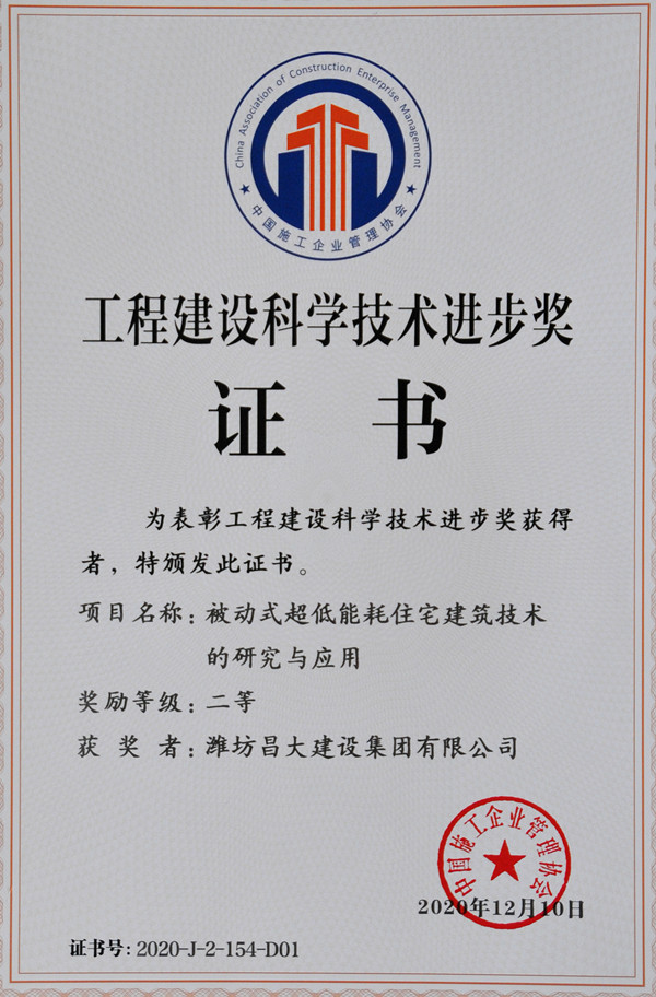 2020年12月11日,中國施工企業管理協會在北京召開“2020年工程建設科學技術獎勵大會”,表彰了工程建設最高科學技術獎1項,工程建設技術發明獎10項,工程建設科學技術進步獎343項。其中,集團二建公司工程公司《被動式超低能耗建筑住宅技術的研究與應用》,經過形式審查、專家網絡評審、專家委員會會議評審、科學技術委員會審定四個階段(本年度評審通過率只有40%),最終榮獲工程建設科學技術進步獎二等獎。