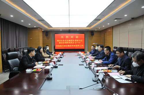 2023年1月10日上午,濰坊水務投資集團黨委副書記、副總經理申來鳳一行4人來集團公司訪問,集團總裁朱九洲陪同。賓主雙方就項目合作、國企混改等方面進行座談交流。 集團副總裁劉雁冰出席相關活動。 集團公司企業發展部總經理張煒、財務部總經理張福濤、法務部總經理高勇、三建公司總經理相有鵬參加相關活動。
