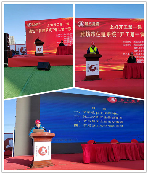 2023年2月15日上午,濰坊市住建系統(tǒng)“開工第一課”啟動活動暨安全教育培訓(xùn)會議在集團(tuán)八建公司高創(chuàng)·水緣灣項目現(xiàn)場舉行。濰坊市住建局黨組書記、局長鐘光文,濰坊市建筑業(yè)發(fā)展服務(wù)中心主任許增賢,高新區(qū)住建局局長牟軍生等出席活動。集團(tuán)公司總裁朱九洲,副總裁楊成國出席并全程參與活動。各縣市區(qū)住建局主要負(fù)責(zé)人、分管負(fù)責(zé)人,相關(guān)業(yè)務(wù)科室負(fù)責(zé)人;房地產(chǎn)開發(fā)企業(yè)、建筑施工企業(yè)、 監(jiān)理企業(yè)分管安全負(fù)責(zé)人,集團(tuán)安全生產(chǎn)部、各基層公司安全總監(jiān)、安全生產(chǎn)部全體人員共約200余人參會。