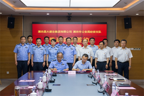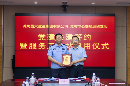 2023年5月18日上午,集團公司與濰坊市公安局經偵支隊黨建共建簽約暨服務工作站啟用儀式在集團總部辦公樓二樓視頻會議室舉行。集團公司紀委書記穆乃杰同志與經偵支隊政委于輝同志分別在《警企共建協議書》、《經偵支隊黨支部與昌大總部黨支部黨建共建協議書》上簽字;穆乃杰同志與市公安局經偵支隊支隊長張伯濤同志共同為經偵支隊昌大工作站揭牌。市經偵支隊副支隊長孫文卿、張樹文、李忠波、秘書科科長李波、經偵三大隊副大隊長王海濤、高新分局經偵大隊長高繼東、高新分局清池派出所所長別在勇,集團公司總部黨支部成員王忠義、付連慶、于宏勝、張煒、韓禎信以及法務部總經理高勇、副總經理張涵參加簽約活動。