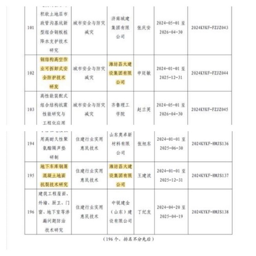 近日,山東省住房和城鄉建設廳下發了《關于公布2024年度山東省住房城鄉建設科技計劃項目的通知》,集團公司申報的研究課題“鋼結構高空作業可拆卸式安全防護技術研發”和“地下車庫鋼屑混凝土地面抗裂技術研究”成功入選,這是集團公司首次獲批立項該科技計劃項目。另據悉,本年度濰坊市僅有4項課題獲評立項,其中集團公司占2項。