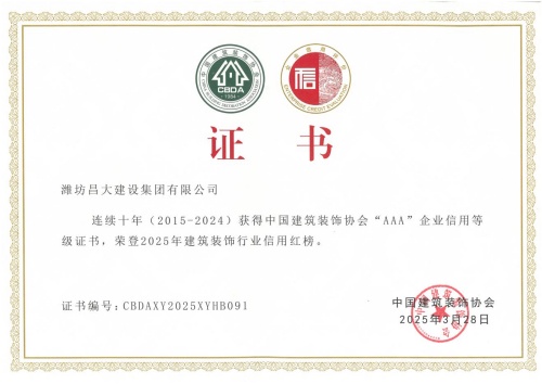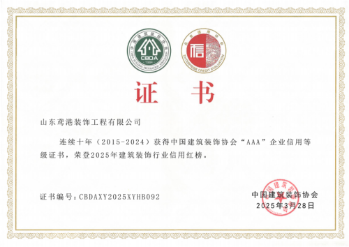 2025年3月28日,中國建筑裝飾協會在武漢召開了首屆大國裝飾可持續發展大會。會上發布了建筑裝飾行業信用建設十年發展報告,公布了連續十年(2015-2024)榮獲中國建筑裝飾協會AAA信用等級企業名單及2025年度建筑裝飾行業信用紅榜獲獎名單,并頒發了榮譽證書。