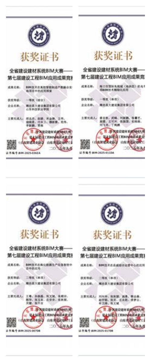 一則是,由山東省建筑業(yè)協(xié)會與山東省建設建材工會聯(lián)合舉辦的2025年第七屆建設工程BIM應用成果競賽公布了獲獎名單,集團公司組織申報的4項成果全部獲獎,其中一等獎2項、二等獎2項。