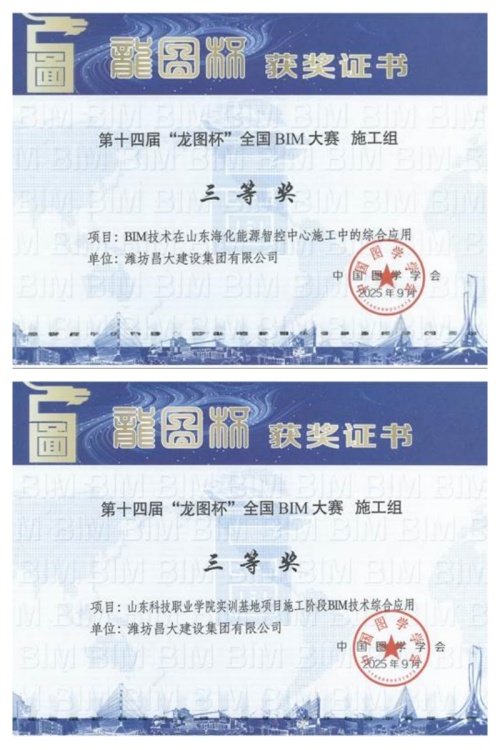二則是,由中國圖學學會舉辦的第十四屆“龍圖杯”全國BIM大賽公布了獲獎結果。集團公司申報的《BIM技術在山東海化能源智控中心施工中的綜合應用》、《山東科技職業(yè)學院實訓基地項目施工階段BIM技術綜合應用》均獲三等獎。實現(xiàn)歷史新突破。