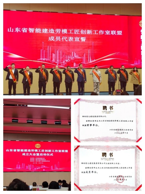 2025年10月31日,山東省智能建造勞模工匠創(chuàng)新工作室聯(lián)盟成立大會暨啟動儀式在濟南舉行。省建設(shè)建材工會主席馬長征、省住建廳質(zhì)安處副處長王曉宏,省建設(shè)建材工會副主席王軼、張棟,省國防機械電子工會三級調(diào)研員馬曉文,省建筑業(yè)協(xié)會副會長兼秘書長劉勇,以及省建材工業(yè)協(xié)會、省建設(shè)科技與教育協(xié)會相關(guān)領(lǐng)導(dǎo),省建設(shè)建材系統(tǒng)、省國防機械電子系統(tǒng)部分企業(yè)工會負責人,各聯(lián)盟理事、成員單位相關(guān)負責人等100余人參加。會上,會議審議并通過了聯(lián)盟章程,選舉產(chǎn)生了聯(lián)盟理事長單位、理事單位、成員單位,頒發(fā)了聯(lián)盟理事長單位、理事單位、成員單位聘書。集團公司當選聯(lián)盟理事單位,集團公司王超創(chuàng)新工作室當選聯(lián)盟成員單位。機施公司工匠王超作為聯(lián)盟成員代表上臺宣誓。